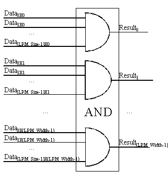 Suppose the designers have three 8-bit buses and they want to AND the corresponding bits of the three buses. This is done using an LPM_AND with an LPM_Width = 8 and an LPM_Size = 3. The LPM_Width of eight indicates that there are eight AND gates, and the LPM_Size of three indicates that each AND gate has three inputs.