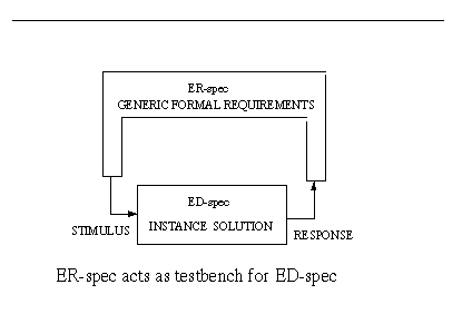 The design specifications are shown in Design Solution N boxes. There can and will likely be more than one design solution, especially during the bidding phase of a project. Each set of design specifications labeled 0-N consists of a set of pseudocode statements that indicate how a proposed solution will conform to the requirement it supports. The example case shown in Figure 2 indicates that the system weight W will be the sum of the weights of two subsystems, Wa and Wb. The example solution also states that S/N shall be calculated as the results of a call to the function representing an algorithm which is exercised during simulation. The results of both calculations along with others can be supplied as inputs during execution of the requirement statements to determine whether the requirement is satisfied. The requirements in the ER-spec are specified as conditional expressions and if results for a proposed system design instance (represented by an ED-spec) are computed according to the rules in the ED-spec and entered into the conditional expression as compare parameters, execution of the ER-spec can generate an evaluation list of satisfied and non-satisfied requirements. Only those items which are true requirements are included in the ER-spec code. Peripheral issues such as additional capabilities or conditions are not included as requirement specifications. The ER-spec can serve as a testbench for the requirement set in the manner shown in Fig. 2 - 2. The ER-spec is the stimulus for the test (ED-spec) and the response of the proposed solution to the stimulus is measured in the ER-spec execution.