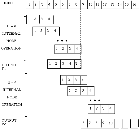 node produces 5 output elements. If the NEPS were set to T=R=C then when the node fired for the second time, the 1st output from the second firing or the 6th data item overall, is a result of the node execution upon the last 3 data items from the first block and the 1st one from the second block as indicated in the tiimeline of Figure 7-2. There are two alternate methods of storing these three data items from the first computation to be used by the second firing. The first technique just stores the 3 values as a node state and set the NEPS to T=R=C. In this case the first node firing produces 5 data items and the second and subsequent times we produce 8. The data set is entirely used if the total input data length is a multiple of T=8.