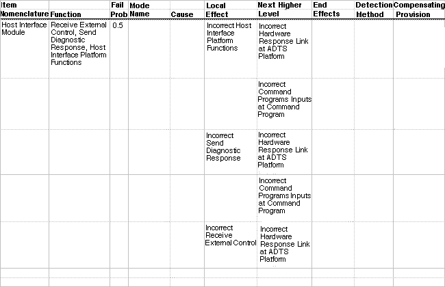 An example of a FMEA spreadsheet populated automatically from the RDD-100 data base is shown in Figure 3-14. Data items that are missing from the worksheet must be manually populated by the engineer.