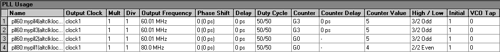 Lists usage information about the PLLs in Cyclone devices and the enhanced PLLs and fast PLLs in Stratix and Stratix GX devices. This section reports the values of the specific output clock(s) for the PLLs in the design. This section is omitted if the Cyclone design does not include PLLs or the Stratix design does not include enhanced or fast PLLs.