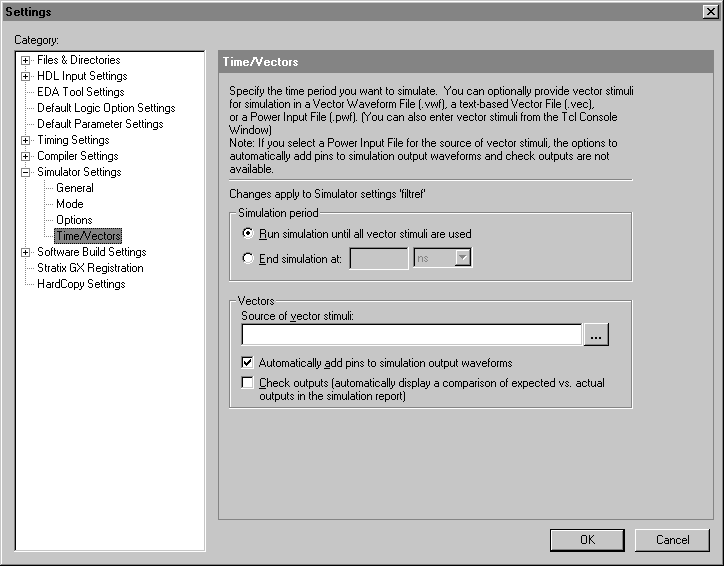 Allows you to specify the simulation time period and the source of vector stimuli.