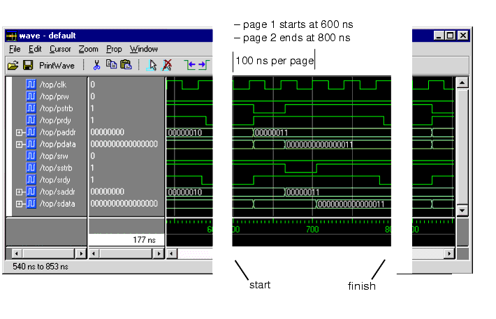write wave -start 600ns -end 800ns -perpage 100ns top.psWrites two separate pages to top.ps as indicated in the illustration (the actual PostScript print out will show all items listed in the Wave window, not just the portion in view):