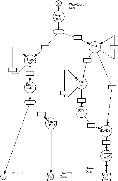 An example of state dependent processing is illustrated by the ETC norm processing. In this case the data stream for each ping was divided up into slices which were batch processed. The first and last slice of each ping is required to be processed differently because the first slice data stream must be augmented by folding the first n data points and adding them to the beginning of the slice. Similarly, at the last slice of the ping the data is folded and added to the end of the last slice's data set. Figure 4-1 shows the feedback data queues that maintain the state or the slice count.
