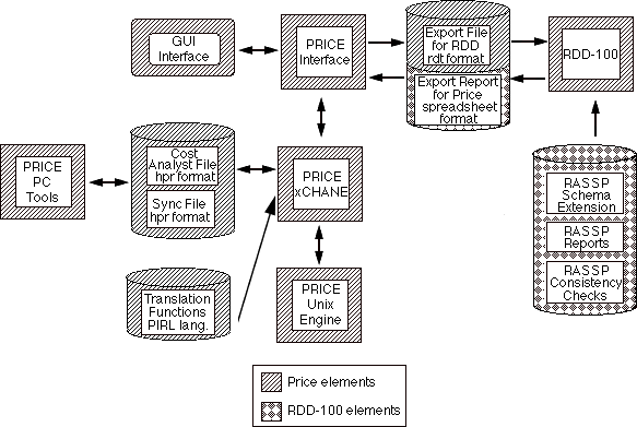 The schema within RDD-100 has been extended on the RASSP program to support both cost estimating and reliability analysis as previously described in section 3.2.3.1. The engineer populates the RDD-100 data base with the system engineering parameters that define the physical configuration of the hardware and software. A consistency report is then executed within RDD-100 to make sure that the database has been sufficiently populated to obtain a cost estimate. An export report is then run within RDD-100 which outputs the system configuration with all the required attributes in the appropriate format (format needed by the PRICE tool is defined in the interface specification) to import into the PRICE cost estimating tools. The cost for each system component is then estimated within the PRICE tool based upon the system engineering parameters and data provided by the cost analyst. The PRICE tool generates an output file in the standard RDD-100 rdt format which contains the development, production and support costs for each system component. This cost data is populated within the RDD-100 data base using the standard RDD-100 import facility.