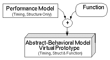 Because the performance model was carefully constructed in VHDL for extensibility, a new modeling effort was *not* needed to construct the prototype from scratch. Instead, the whole performance model was re-used by simply adding the missing functionality to it, as shown in figure 1. In this way, the performance model was extended to an abstract-behavioral model. It is abstract because it does not resolve the actual bit-representations of the values or structures. It is a behavioral model because it describes both functionality and timing aspects. See the VHDL Taxonomy document for more details on these concepts.