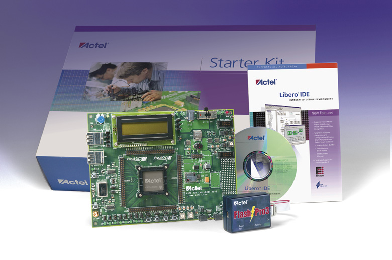 The ProASIC3 Starter Kit is a complete package that enables you to quickly evaluate Actel's ProASIC3 family and prototype your design.The low-cost ProASIC3 Starter Kit comes in two versions and contains everything you need to start using the advanced features of Actel's ProASIC3 family including the capability for designs with 600k gates using Libero IDE Gold. The advanced version features a socketed board with an A3PE600 device in a PQ208 package, allowing other devices from the ProASIC3/E family to be fitted to the board. The second version comes with an A3P250 device directly soldered to the board.