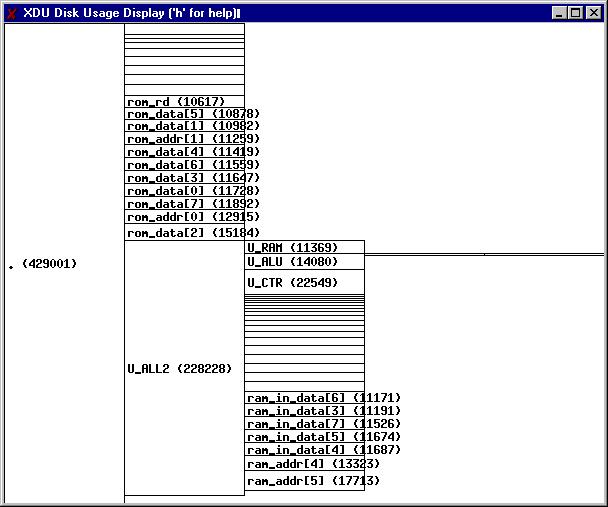 The image below shows the output from the architectural view tool. It can be seen that U_RAM, U_ALU, U_CTR, and the buses for RAM and ROM are the most expensive components. Xdu allows you to explore this hierarchy in much more detail than is shown in the image. (Architectural view tool output displayed in xdu, values are in 1/1000mW)