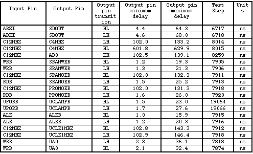 - Total Port signals 76 Inputs 32 Outputs 28 Bidirects 16 - Total VSS and VDD pins 8 - Cell and block counts: Local Global Cells 131 1921 Blocks 231 13047 - p and n-transistor counts: p: 13486 n:13399 - Number of gates: 5624 - Full internal scan - Scan port signals provided to facilitate internal scan but there is no JTAG 1149.1 implementation. - NAND tree implemented for DC tests. - Functional patterns @1MHZ are used to achieve 98.1% Port fault coverage with ac delay measurements. - 84 pin ceramic flatpack