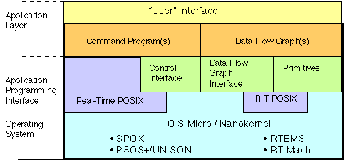 The application layer of the software architecture consists of an interface to the world outside the signal processor in addition to a command program and data flow graphs. The outside "user" could either be an actual user, or more likely, it could be a higher-level system as part of an overall platform. The division of the application into two parts is similar in concept to the Processing Graph Method (PGM) developed by the Naval Research Laboratory. The first part of the application layer is the command program, which provides response to external control inputs, starts and stops data flow graphs, manages I/O devices, monitors flow graph execution and performance, starts other command programs, and sets flow graph parameters. The control interface provides services that implement these operations. The second part of the application layer is the DFGs, implemented using a tool such as Management Communication and Control, Inc. (MCCI's) autocode or the LM/ATL's Graphical Entry Distributed Application Environment (GEDAE ). The DFGs represent the signal processing algorithms that must be applied for each operating mode of the signal processor. Services provided by the data flow graph interface, which are largely invisible to the developer, include managing graph queues, interprocessor communication, and scheduling.