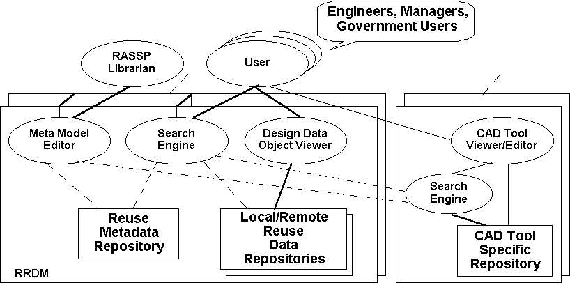 Once a CAD tool has been invoked, the designer interacts with the tool in its native environment to perform a design or analysis activity. He or she may invoke the RRDM through the CAD tool environment or directly. The RRDM may receive reusable design knowledge from the CAD tool, or meta-data only in cases where the design is managed in place. Additional meta-data is solicited from the environment as well as from the designer through the use of domain-specific templates. Both the meta-data and design knowledge (where applicable) are stored in the local design knowledge repository. The workflow manager for the RASSP Enterprise System is implemented through Intergraph Corporation's Design Methodology Manager (DMM), and the product data manager is implemented by the Intergraph Asset information Manager (AIM). Additional information on the RASSP Enterprise System is provided in Enterprise Application Note