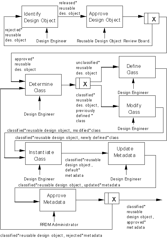 The default workflow for addition of reusable design objects to the RRDM is shown in figure 3 - 1 and represented in IDEF3 (Integrated computer aided manufacturing DEFinition) notation. The boxes represent individual activities in a process, and the links between the activities represent precedence relationships between activities. The links are annotated with information about the data that flows between two activities -- the state of the data and the type of data separated by a '*'. A junction box, represented by a box with a vertical line parallel to the left edge and an 'X' within the box, is used to model alternate paths within a workflow. The arrows coming into the bottom edge of an activity box indicate the mechanisms that are involved in the activity, usually the job classification of the individual(s) performing the activity. The workflow is implemented using the workflow manager of the RASSP enterprise framework and may be further customized by a RASSP administrator for a particular organization.