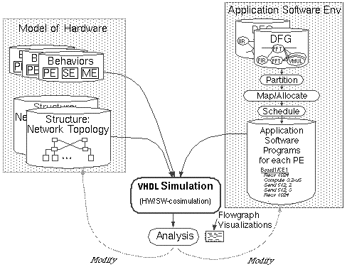 Figure 5 - 1 below illustrates the co-design concept as applied to Lockheed Martin ATL's performance modeling environment. The shaded block on the left indicates the description of the candidate hardware system, while the shaded block on the right indicates the description of the system's application software. The hardware is described as the topological interconnection of the building-block element models. The software is described at several levels beginning with the data-flow-graph (DFG) of the application and resolved to sequences of abstract software tasks for each target processor element. The target software programs are the result of a partitioning, mapping, and scheduling process. The proposed hardware and software design are brought together during simulation. The system is simulated as the software executing on the hardware. The abstract target software programs are interpreted by the abstract hardware models. The results of simulation consist of time-lines and utilization statistics that are then analyzed for improvements to the hardware, the software, or combinations of both.