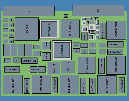 Using the SavanSys tools a preliminary layout was developed for the c6201. Because the c6201 had a smaller footprint than the c80, six of the 200 MHz c6201s with their external memory fit in the same space as four c80s (see figure 11). Again, a mezzanine card was not required for the template storage memory. This preliminary board layout resulted in 67% utilization of the available VME-6U board space.