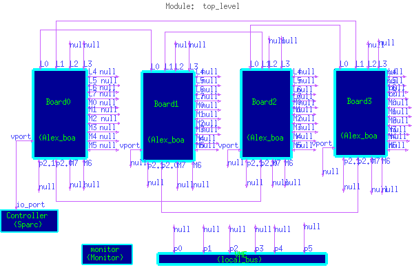 Figure 20 shows the top level topology of the four Alex board model. Figures 21 and 22 show the lower layers in the hierarchy for the Alex board and Sharcpac models respectively.