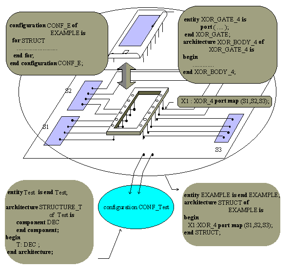In this example, the configuration declaration of design entity EXAMPLE is used. It binds EXAMPLE design entity to DEC component by using its configuration CONF_E as an entity aspect for T_1 component instance in the body architecture STRUCTURE_T.