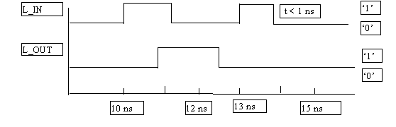 The signal value L_IN is assigned to the signal L_OUT with 1 ns delay. Not all changes of the signal L_IN, however, will be transmitted: if the width of an impulse is shorter than 1 ns then it will not be transmitted. See Fig. 2 and the change of L_IN at 13 ns and again at 13.7 ns.