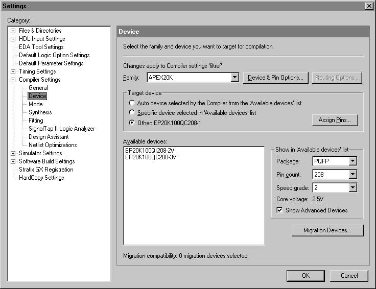 Allows you to specify the device family of the device you want to target for compilation, whether to use a specific device or automatic device selection, the devices available for device selection, and the specific target device (if applicable).
