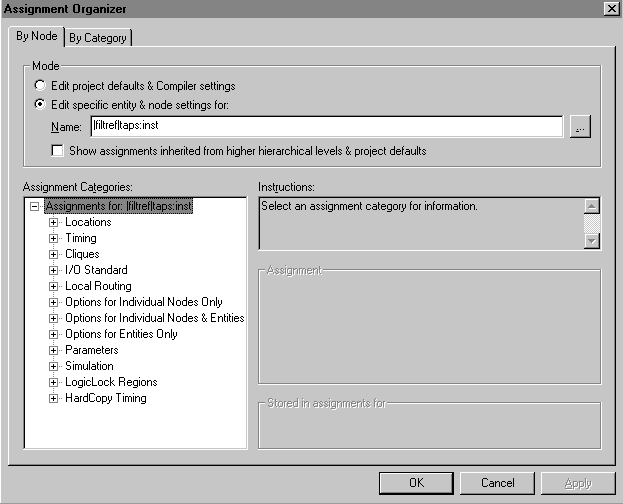 You can assign the logic in your design to specific device resources. For example, you can assign the logic of a block in a Block Design File (.bdf) to a specific MegaLAB row in a device. MegaLABs are large-scale structures within APEX 20K, APEX II, and ARM®-based Excalibur devices. To assign the logic of the taps block to the first row (that is, row A) in the device, follow these steps: