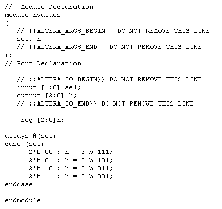 9. Add the following lines to the hvalues.v file to implement the design. Insert these lines just before the endmodule statement: