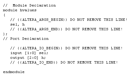NOTE You may notice a few pairs of Quartus II-generated comments that start with "ALTERA" and end with "DO NOT REMOVE THIS LINE!" The Quartus II software updates the information between these pairs of comments, so you must not enter text between them. However, you can enter other Verilog HDL statements outside these commented sections.