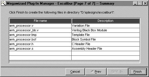 Click Finish to create the ARM-based Excalibur embedded processor megafunction.