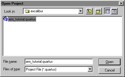 In the \qdesigns\excalibur subdirectory, select the Altera-provided arm_tutorial.quartus project file in the File name list.