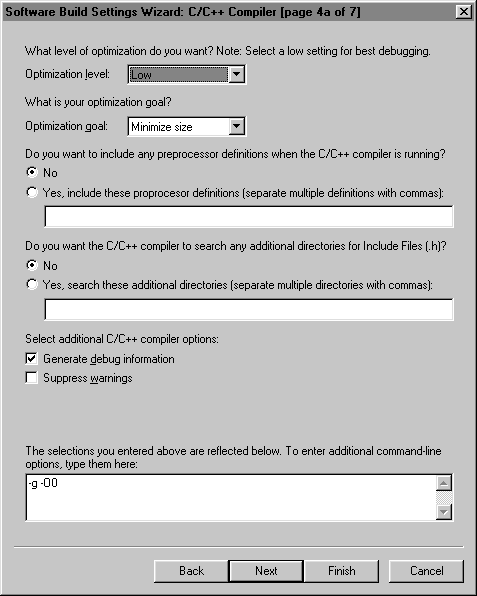 1. In the Software Build Settings Wizard: C/C++ Compiler page 4a, specify the following responses to the wizard prompts: