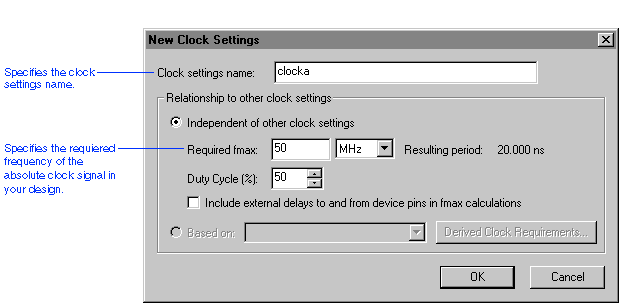 To specify the required fMAX of the absolute clock, in the Required fmax box, type 50 and select MHz in the list.