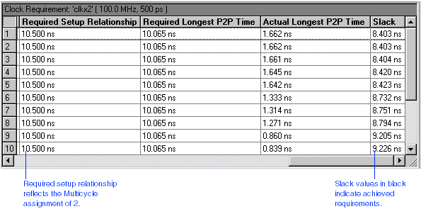 Under the Timing Analyses folder, select the Clock Requirement section for the clkx2 signal. The Clock Requirement section displays all slack values in black, indicating that all timing requirements were achieved after overriding the default setup relationship with the Multicycle assignment.