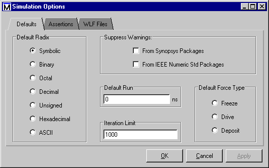 Selecting From Synopsys Packages suppresses warnings generated within the accelerated Synopsys std_arith packages. Edit the StdArithNoWarnings variable in the modelsim.ini file to set a permanent default.Selecting From IEEE Numeric Std Packages suppresses warnings generated within the accelerated numeric_std and numeric_bit packages. Edit the NumericStdNoWarnings variable in the modelsim.ini file to set a permanent default. - Default Run