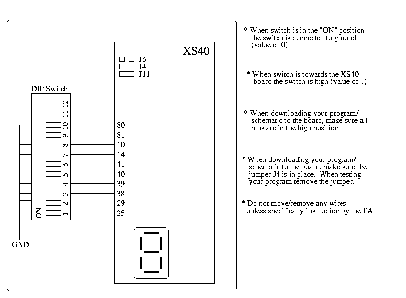 DIPconnect.gif Schematic which shows the DIP switch connections to the XS40 board pins, shows the jumpers, and some tips on downloading unto the board.