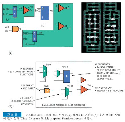 AMI Semiconductor, Chip Express, Faraday Technology, Fujitsu, Lightspeed Semiconductor, NEC, ViASIC µî ¾÷üµéÀº ÇöÀç Àú¸¶´Ù ±¸Á¶ÈµÈ ASIC ¿þ¾îÀÇ È«º¸¿¡ ¿À» ¿Ã¸®°í ÀÖ´Ù. ÀÌ °¡¿îµ¥ AMI´Â ÇöÀç ±¤¹üÀ§ÇÑ ½Ç¸®ÄÜ °ø±Þ¾÷ü°¡ ¾Æ´Ñ À¯ÀÏÇÑ º¥´õ·Î Ȱµ¿Çϸç FPGA ·ÎÀÇ º¯È¯ Æ´»õ¿¡ ³¢¾î µé°í ÀÖÁö¸¸, °ú°ÅÀÇ °ÔÀÌÆ® ¹è¿ Ç÷§Æû ´ë½Å ±¸Á¶ÈµÈ ASIC Åä´ë¸¦ »ç¿ëÇϰí ÀÖ´Ù. ÀÌ¿Í ¹Ý´ë·Î Lightspeed Semiconductor´Â ±âÁ¸ÀÇ ASIC¿¡¸¸ ÁÖ·ÂÇϱâ À§ÇØ XilinxÀÇ FPGA °°Àº ºñ¿ë Àý°¨Çü ½ÃÀåÀ¸·ÎÀÇ È®Àå¿¡¼ ¼ÕÀ» ¶¾ »óÅ´Ù(Âü°í ÀÚ·á 2). Chip ExpressÀÇ ±¸Á¶ÈµÈ ASICÀº ´Ù¾çÇÑ ´ë¾È Áß¿¡¼ °¡Àå ¼¼¹ÐÇÑ ·ÎÁ÷ ºí·ÏÀ» »ç¿ëÇÏ´Â °ÍÀ¸·Î ¾Ë·ÁÁ® Àִµ¥, ÀÌ ¾÷üÀÇ ¼ÒÀÚ¿¡´Â ¼³°è¿¡ µû¶ó ·ÎÁ÷ ¸ðµâ ´ç ¼¼ °³ ³»Áö ³× °³ÀÇ °ÔÀÌÆ®°¡ µé¾î°£´Ù°í ÇÑ´Ù. ´Ù¸¥ º¥´õµéÀÇ ·ÎÁ÷ ºí·ÏÀº ´ëºÎºÐ Àú¸¶´Ù 20~40 °ÔÀÌÆ®¿¡ »ó´çÇÏ´Â ¼³°è¸¦ ±¸ÇöÇÑ´Ù(±×¸² 5).