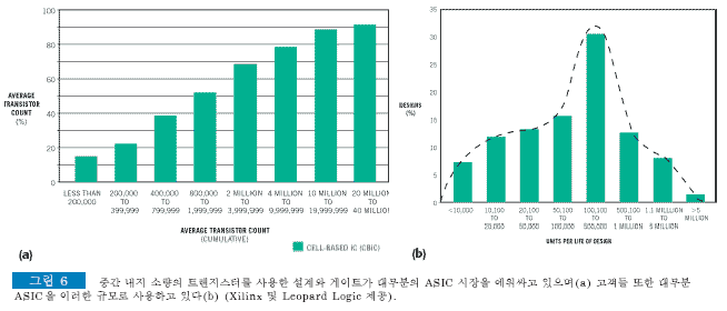 FPGA´Â XilinxÀÇ ÃֽŠSpartan 3 Á¦Ç°±º¿ë 90nm °øÁ¤(Âü°í ÀÚ·á 1) °°Àº µö ¼ºê¹ÌÅ©·Ð °øÁ¤ ´öºÐ¿¡ Ĩ ´ç °ÔÀÌÆ® ¼öÀÇ ÁýÀûµµ°¡ °¥¼ö·Ï Áõ°¡Çϰí ÀÖ´Ù. FPGA¿¡¼ Á¦°øÇÏ´Â ¿ë·®Àº ƯÈ÷ ¼³°è¿¡¼ FPGAÀÇ ÀÓº£µðµå ¸Þ¸ð¸® ¹è¿, È®»êÇü ¾Æ³¯·Î±× ¹× µðÁöÅÐ ±â´É ºí·Ï(DLL ¹× PLL °°Àº), °ö¼À ´©»ê±â(multiply-accumulator), SERDES(serializer/deserializer) ȸ·Î, °í¼Ó I/O ¹öÆÛ µîÀº ¹°·Ð À̵û±Ý CPU ÄÚ¾î¿Í °ü·Ã ÁÖº¯±â±â¸¦ »ç¿ëÇÏ´Â °æ¿ì¿¡µµ Ź¿ùÇÑ ¼º´ÉÀ» ¹ßÈÖÇÑ´Ù. °í°´Àº °¢ÀÚÀÇ ¼³°è¿¡ ÇÊ¿äÇÑ ¸¸Å¸¸ FPGA¸¦ ÁÖ¹®ÇÒ ¼ö ÀÖÀ¸¸ç °ø±Þ¾÷ü¿¡ NRE(nonrecurring-engineering) ºñ¿ëÀ» ÁöºÒÇÒ Çʿ䵵 ¾ø´Ù. º¥´õ´Â ÀÌ¹Ì Ä¨ÀÇ ·ÎÁ÷, ¸Þ¸ð¸®, ½ÅÈ£ ¹è¼± ¹× Àü·Â Ç÷¹Àο¡ ´ëÇÑ ·¹À̾ƿôÀº ¹°·Ð µð¹ö±ë±îÁö ¸¶Ä£ »óÅÂÀÌ´Ù.