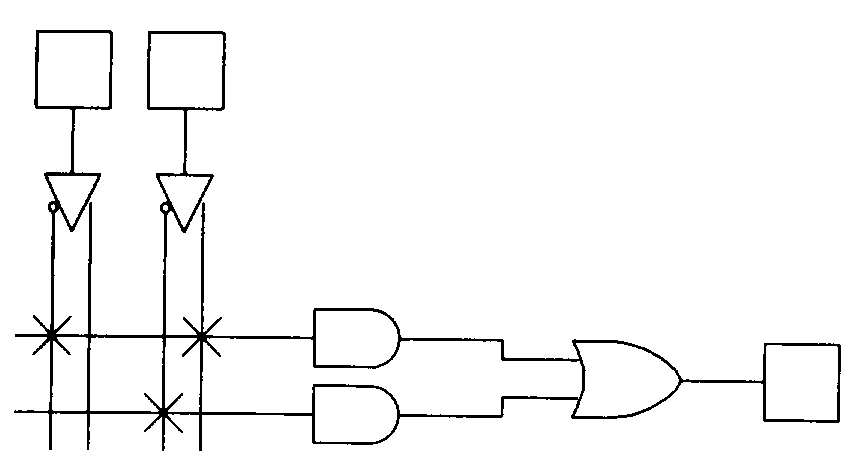 A simplified programmable logic array composed of two inputs and one output is shown in Figure 1.