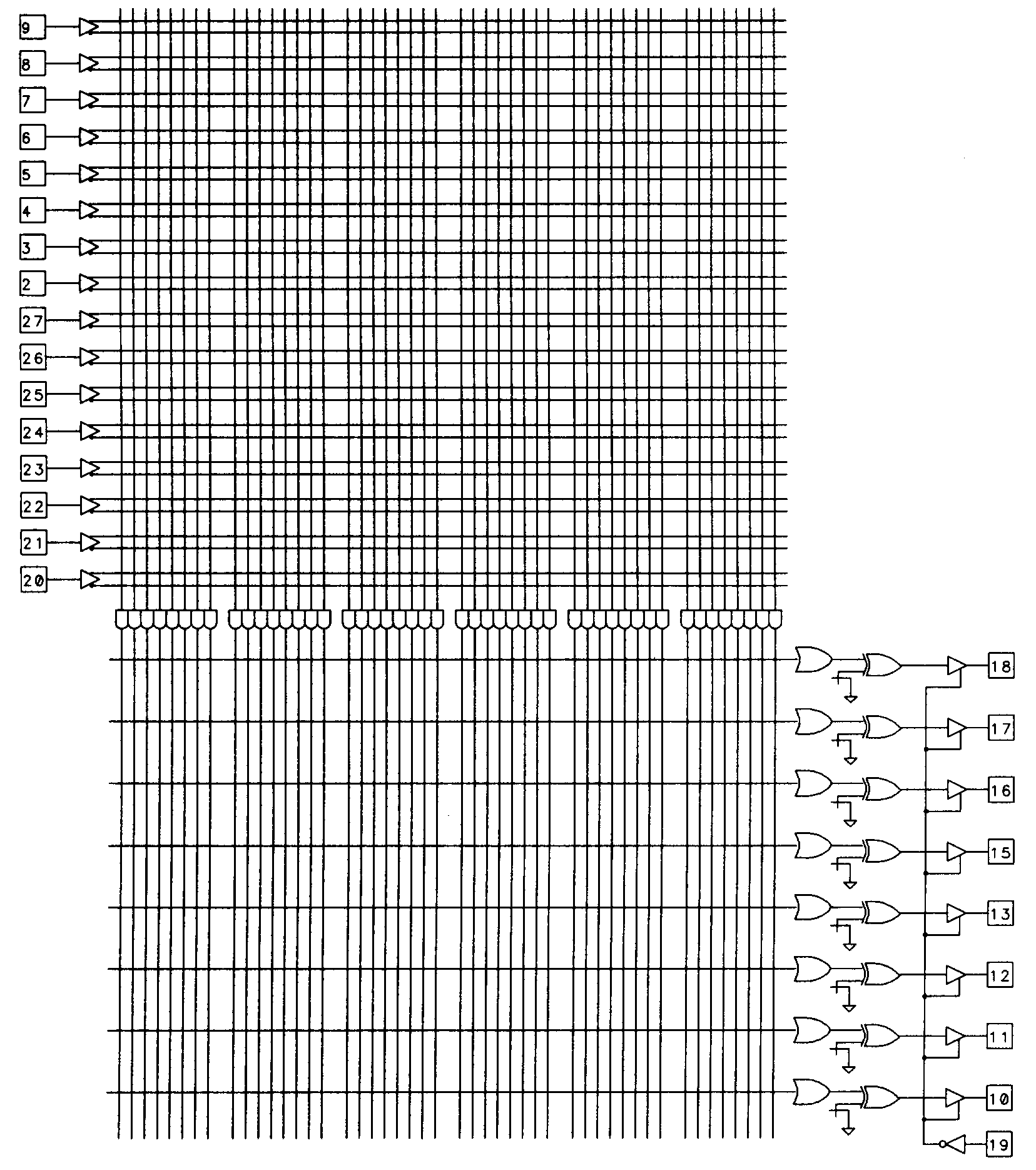 Exclusive-OR gates, or XORs, are found in PALs for a variety of purpose. (We have already seen how XORs are used to implement fuse configurable output polarity). XORs have other applications as well. Figure 26 is the logic diagram for the 20X8 device.